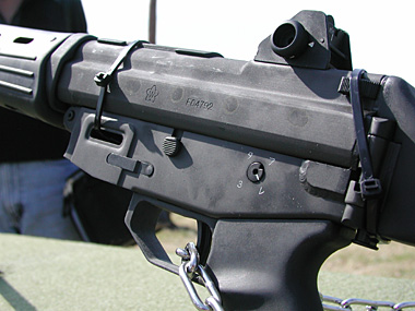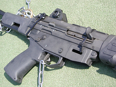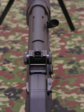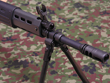 独特のフロントサイト、発射サイクルを調節するガスレギュレーターフラッシュハイダー、そしてバイポッドなどリアルに再現されている。銃を手にとってすぐわかるのがその剛性の高さだ。明らかにこれまでの電動ガンとは一線を画する剛性感で、フレームのギシギシなどは一切皆無。メタルフレームとアルミアウターバレルでがちがちに固めたM4フルメタルカスタムのような状態。各部をこぶしで軽くたたいてもゴツゴツと一本の鉄の塊のような響きを醸し出す。コレはスゴイ。