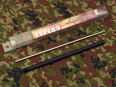 最近ゲームでも頻繁に89式を使用しているが、89式の不満点は長いことと、重いこと。まずは長いことを解消すべくショート化に踏み切った。ハンドガードにはバッテリーが入るのでむやみに短くできない。そこでこのパーツ。アウターバレルをフロントポストぎりぎりまで短くすることで全長を86mm短縮できる。もちろん軽量なアルミ合金製。さらに冷間鍛造伸菅法により公差±0.004mmという高精度の内径6.05mmインナーバレルまでセットになっている。バレル長も86mm短くなってノーマル433mmに対して347mmとなる。これにより本来であればシリンダー容量も調整する必要があるが、組み込んで撃ってみた所、弾道の乱れもなく、むしろノーマルより精度があがっているような気もしなくもないので、メカボチューンの面倒くささとあいまって、このままにすることにした。