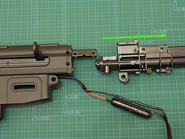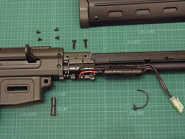 組み込みは比較的簡単にいくと思っていたが、ハンドガードロックピンの穴のくぼみの位置が微妙にずれていてピンがはまらなかったので、丸棒金ヤスリでゴリゴリと削る必要があった。また、バッテリーホルダーは4本のネジでアウターバレルに固定されるが、そのうちのチャンバー側の1本がネジ穴がユルユルで固定できなかった。ただ、ネジ一本固定しなくてもなんら問題ない。
