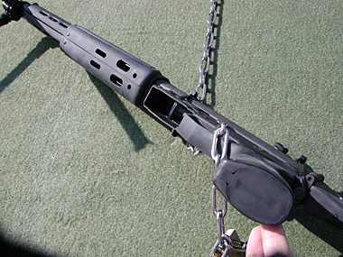 ハンドガードを固定するロックピンはストッパーが効いており、紛失しにくい設計になっている。このロックピンを引いて、ハンドガードを前方にスライドさせればハンドガードを取り外すことができる。