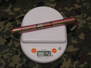1400mAhというと、マルイ純正のニッカドラージバッテリーより容量が多い。約1/3の容積でどう容量を実現している。重量は172g。ちなみにGP1100は162gなので、ちょっと重い。