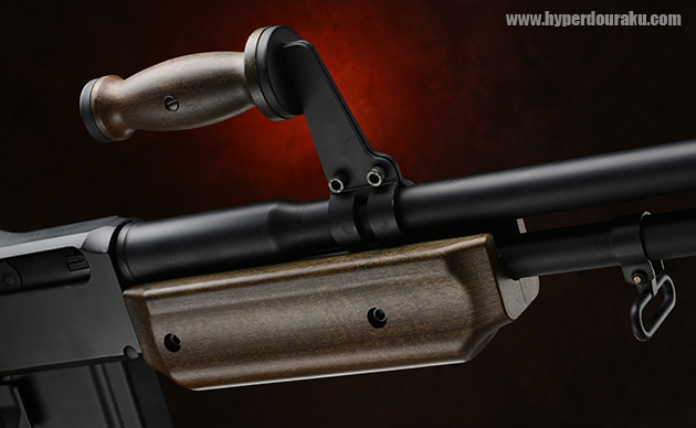 ハンドガード、ストックはリアルな木目調のプラ製。付属のバイポッド、キャリングハンドルを取り付ければサバゲーでの拠点防衛にも最適。もちろんこれらを取り外して軽快にフィールドを駆け回るのもよし。気分は米ドラマ「コンバット!」のカービー二等兵か、アニメ「ストライクウィッチーズ」のシャーロット・E・イェーガーか。