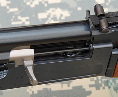 ホップアップ調整はチャージングハンドルを引きながら、エジェクションポート内にあるスライドレバーで調整する。
