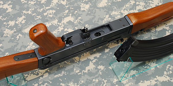 アッパーレシーバーはスチールプレス製でレシーバートップのキャッチボタンを押すことで簡単に取り外すことが出来る。折りたたみストックモデルのAK-47Sはこの部分に棒タイプの