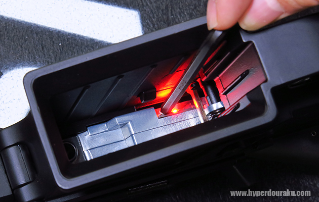 発射モードを切り替えはマガジンハウジング内にあるスイッチをドライバーやレンチで長押します。赤いLEDが点灯し、2回点滅したらスイッチを離せば発射モード切り替え完了です。