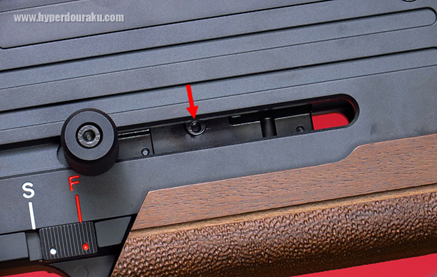 コッキングハンドルは軽めで引きやすいのですが、リターンスプリングがないので、ボルトを手で戻す必要があります。コッキングするとホップアップ調整レバーが現れます。調整にはレンチやドライバーを使った方がよいでしょう。