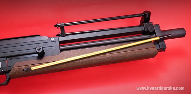 マズル下の下面にあるレバーを押します。そうすると給弾棒が出てきます。BB弾が装填されていない時はバレルを下に向けて取り出します。