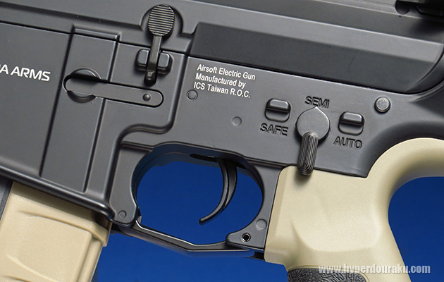 もちろんHERA ARMSのライセンスを取得し、ASGとICS Airsoftが共同で開発した電動ガンです。メカはICS最新のSSS.II(Self-diagnostic Shooting System = 自己診断射撃システム)で、電子トリガー+MOSFET搭載し、3バーストへの切り替えが可能、さらにピストンが後退位置で待機状態になるプリコッキング方式を採用しています。