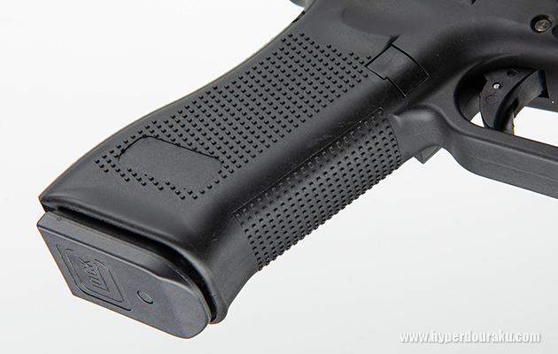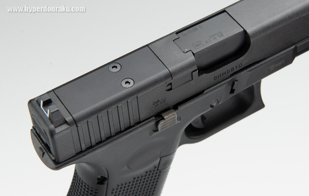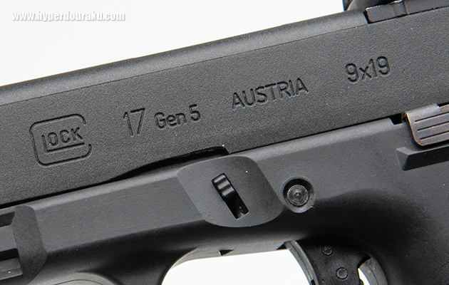 スライド前方にもセレーションが切られており、これは現行型のG17 MOSの特徴でもある。スライドフレームともに硬質感のあるナイロン樹脂。