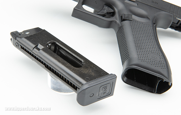 このマガジンは新規製作となっているそうで、他社製のグロック系マガジンとは寸法が違うとのことだ。マガジンの互換性がないのはそれだけ安全性が高いことになる。Carbon8なども既存の同系モデルとあえてマガジンの互換性が無いように作られている。間違ってCO2マガジンをリキッドチャージ式ガスガンに使ってしまい、破損したり、初速オーバーすることもなくなるからだ。