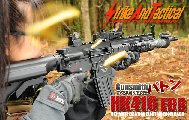 バトンのHK416 EBBは、2011年3月に発売されたTOPの排莢式電動ガンM4A1カービンをベースにHK416フレームを組み込んだコンプリートカスタムガン。100丁の限定発売で2012年4月27日より同社の通販サイトで予約販売を開始した。