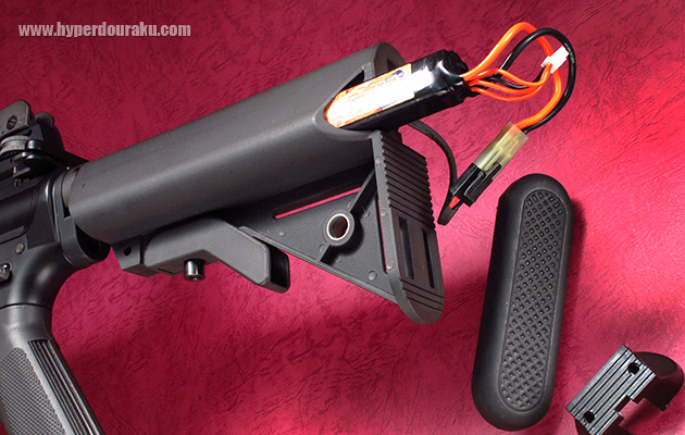 BOLTの電動ガンは東京マルイの次世代同様にリコイルシステムがリコイルバッファチューブ内に内蔵されているため、バッテリーは収納できません。そのため、クレーンストックのバッテリーケース内に収納します。各種スティックタイプのリポを搭載できます。