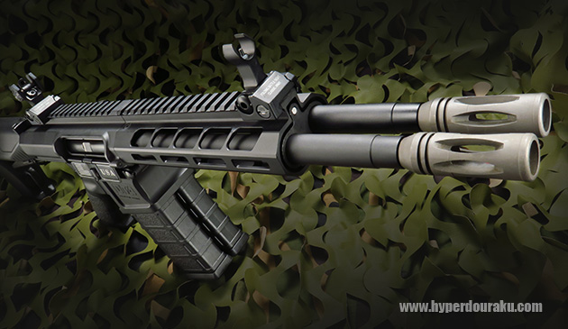 このDT-4の特徴はなんといっても、2連に並んだバレルでしょう。そのため、アッパーレシーバーはかなり幅があります。フラッシュハイダーはスチール製で14mm逆ネジ仕様です。バレル間が狭いため、サイレンサー、トレーサーなどを装着する場合は径のなるべく細いタイプを選択したほうが良いでしょう。