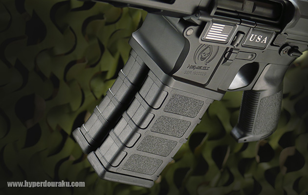M4レシーバーのスタイルを継承していますが、エジェクションポートが両サイドにあります。またグリップ周り以外、アッパーレシーバーやマガジンハウジング部は約15mmずつ厚みが増しています。