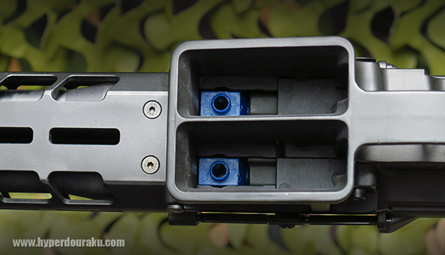 マガジンも分厚いハウジングに2本装填します。これだけでもかなり見た目のインパクトがあります。ハウジングは1本ずつ独立しており、チェンバーも二つあります。
