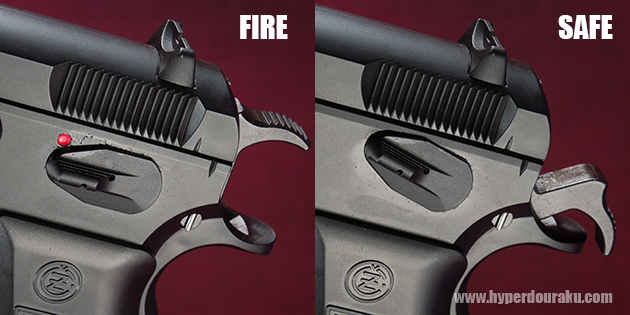 左面にセフティがあります。赤丸が見えている状態で「FIRE」です。レバーを上に押し上げて「SAFE」になります。ただしセフティはコック&ロックで、ハンマーを起こした時にのみ掛かります。Cz75はダブルアクションでも撃てますので注意してください。