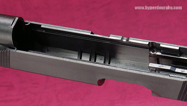 また、スライドストップのノッチも半分が金属パーツで覆われていますが、ノッチ欠けのためではなく、あくまでもレールの補強のためとのことです。スライド自身がナイロン樹脂なので、通常のABS樹脂より強度はあるのだと思われます。