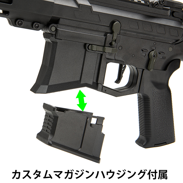 C.A.T.独自の機械式プリコック機能+INAZUMAカスタムモーターによりトリガーのレスポンスはキレッキレ。バリケード越しの一瞬の敵に素早くBB弾を叩きこめるプリコック機能は、ハイエンド電動ガンに搭載されることが多い機能だが、本モデルはリーズナブルな価格で搭載し、コスパは良好だ。