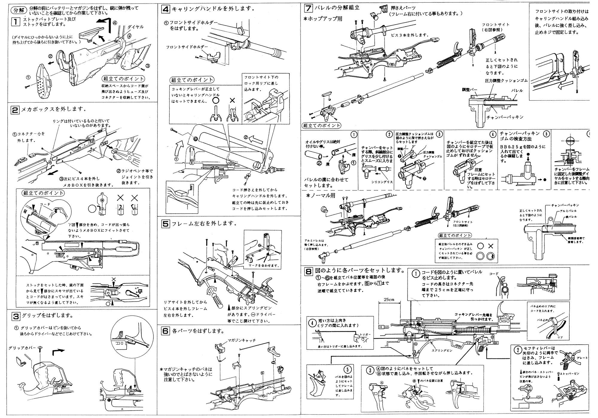 ポリカーボネイトピストンとスプリングをM90へ交換、その後に発売されたFA-MAS用のスプリングガイド、エクセライドシムでギア音を調整した。なお、メカボックス内部の隙間には、ブチルゴムを張りつけて、フレームの共振を防いでいる。 ※本記事は平成18年8月21日に施行された銃刀法改正前に書かれたレビューです。トイガンのパワーには法規制がありますので、遵守・ご注意ください。 |
