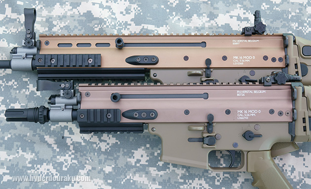 PDWのショート版アッパーレシーバー(下)にはチャージングハンドル前方のスリットが無く、これがファースト・オリジナル設計のパーツである事を雄弁に物語る。FDE(フラットダークアース)のアルマイト色調やレーザープリントの文字等も東京マルイSCAR-Lとは異なるのもオリジナルテイスト抜群だ。