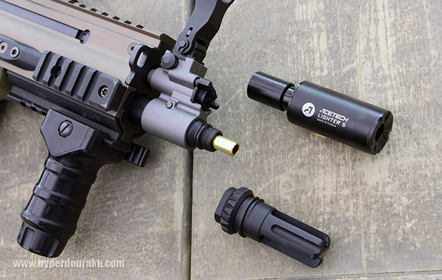 SCAR-L PDWにオススメのオプションは? と東京サバゲパークのスタッフさんに問い合わせたところ、「ACETECHのトレーサーがイチ押しです!」との事。確かに全長のコンパクトさも損なわず、銃口部の造形もカッコ良く、低照度下のインドアゲームやCQBで抜群の相性だ。