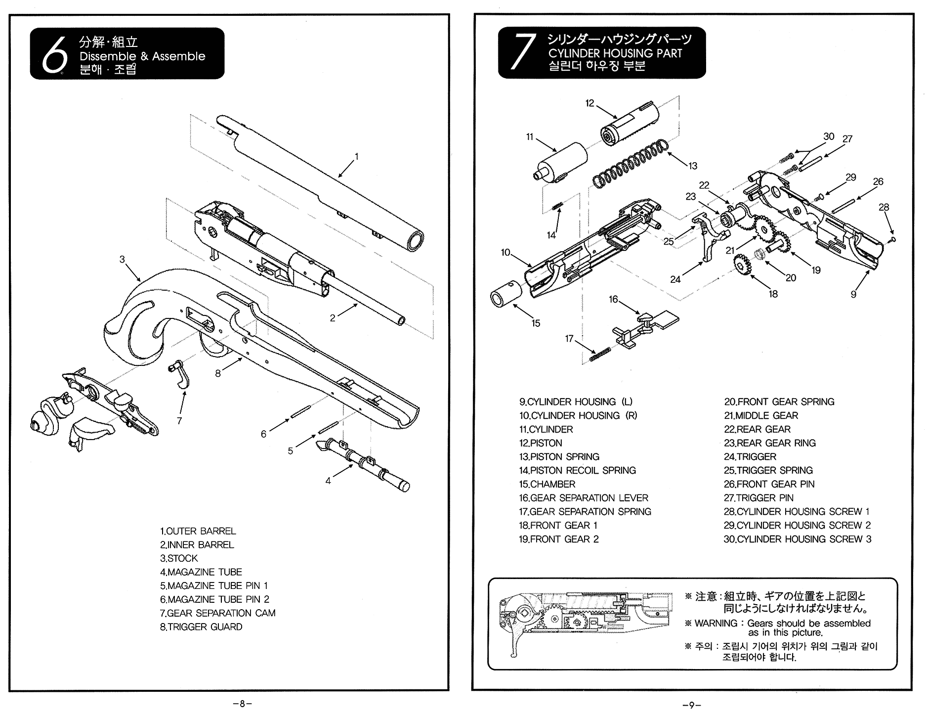 コッキングはほどよく堅いが片手で操作できないほどではない。構造的にはコッキングに連動して内部の3つのギアを介してピストンをコックさせている。まるで電動ガンのような仕組み。