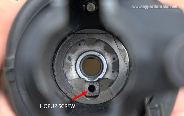 Ver.2で改良されたホップチャンバー。チャンバー下の小さい穴に付属の長い6角レンチを差し込んで調整するように変更された。以前はアウターバレル基部下側だったので、ハンドガードをレールシステムに交換する自由度が高くなった。