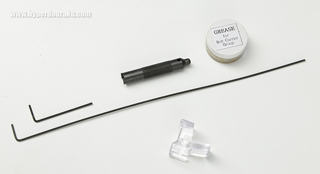 付属のツール類。ホップ調節用の長い六角レンチが付属する。黒い筒状の工具はボルトキャリアノズルの交換用ツール。ノズルは樹脂製なのでもし破損した場合はこの工具で交換できるそうだ。