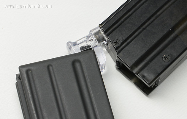 透明なパーツはBB弾装填用のアダプターだが、これを使用しても装填しにくかったので、テストではパーツを使用せず、直接BBローダーにて装填を行った。