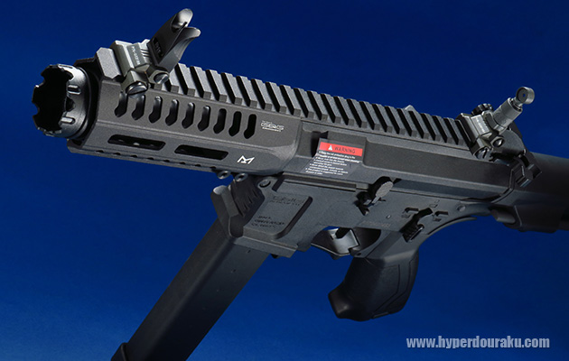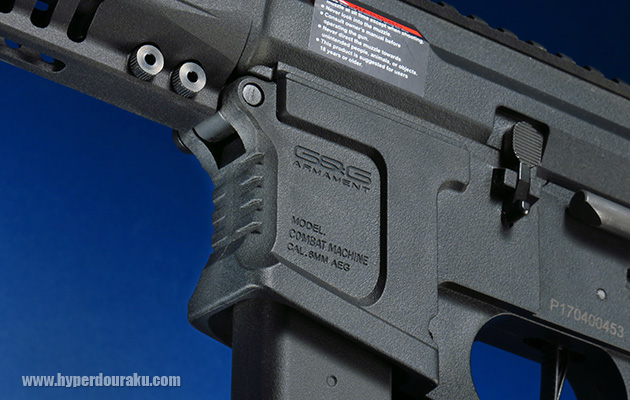 ハウジングのロゴは控え目にG&Gのロゴとモデル名が入っています。また5.56mm弾用のハウジング形状は9mm弾用を使用する細いマガジン専用となっています。