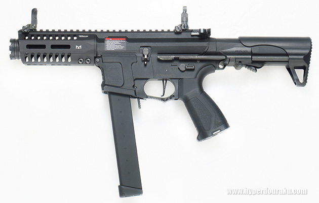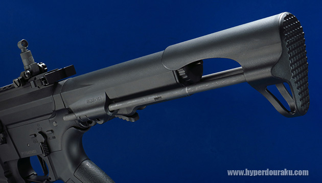ストックは以前レビューをしたG&G製のPDW 15CQBとまた違うデザインで、二段階伸縮式のGOS-5Vストックを採用しています。