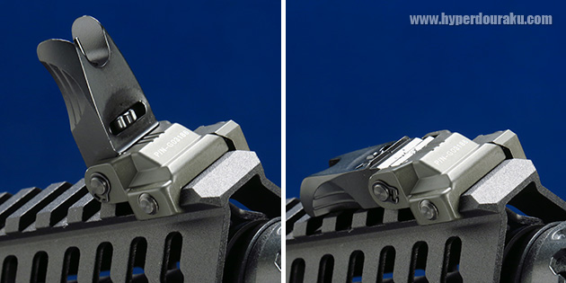 フリップアップ式のフロントサイトが標準装備です。サイトは上下の調整が可能です。畳んだ状態から起こしやすいようにサイドが大きく抉られています。