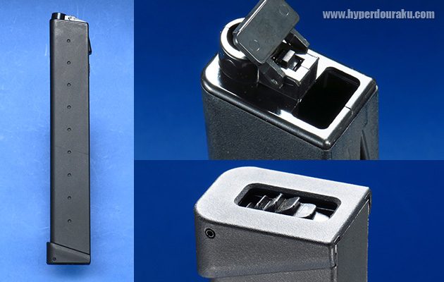 まるでグロッグのロングマガジンのようなデザインです。マガジンもナイロンファイバー製で全長は225mm、重量は143gと軽量です。細いながらも装弾数300発を誇る多弾倉マガジンが標準装備です。