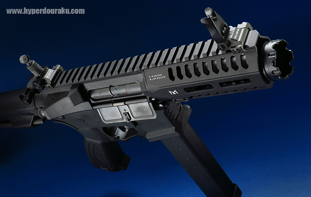 大型のハイダーが特徴的なマズルフェイスです。レールハンドガード長は5インチで材質はアルミ製です。左右と下面はM-LOKとなっています。