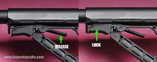 前方のレバーでストック長をロックすることもできます。またストック内にCR123Aバッテリーを収納することもできます。