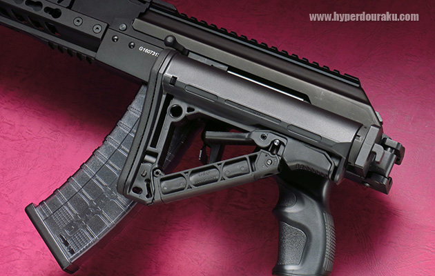 ストックを折り畳めば、コンパクトになります。ストックが最短の時でも干渉せずに射撃は可能ですが、ある程度、ストックは伸ばしたほうがよいかと思います。