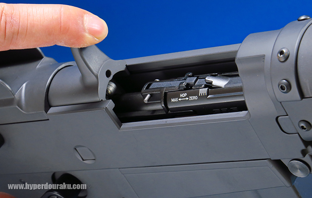 エジェクションポートはトップにあり、ハンドルも上向きになっています。ボルトは引くことができます。ボルトは後退位置で止まり、解除はボルトリリースボタンで行います。エジェクションポート内にホップアップのメモリが表示されてますが、調節はここでは行いません。