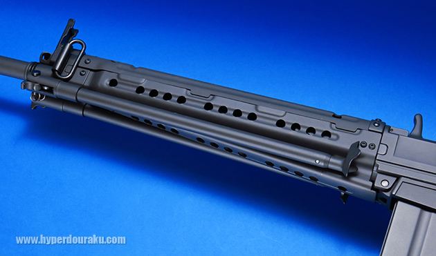 折り畳んだ二脚と干渉しない複雑な形状のハンドガードも再現されています。ハンドガード前後にある固定するリベットはネジ仕様になっています。