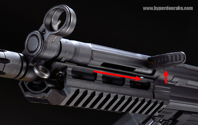 ハンドルを起こしてコッキングレバーを引くとエジェクションポートが開きます。ロックが可能なので、ホップアップ調整時には重宝します。
