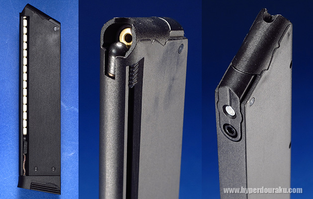 マガジンは亜鉛ダイキャスト製で装弾数は17発、重量は203gです。BB弾を装填するとき、フォロアーを一気に離すとBB弾が飛び散ります。ゆーっくりフォロアーを戻しましょう。スペアマガジンは3,400円(税別)です。