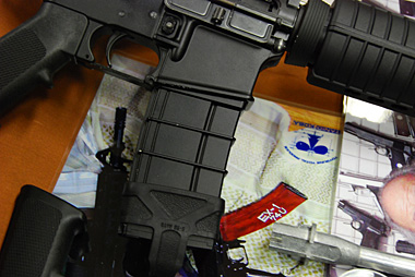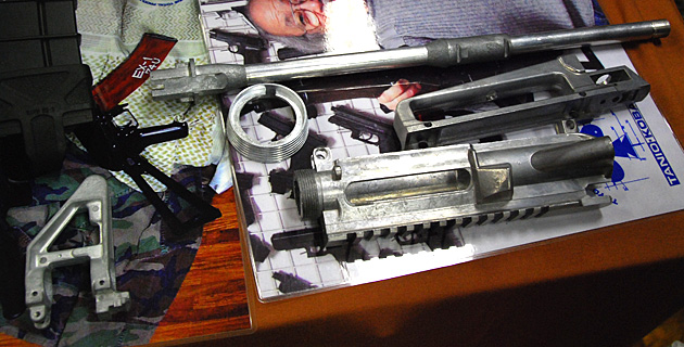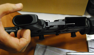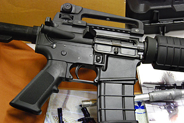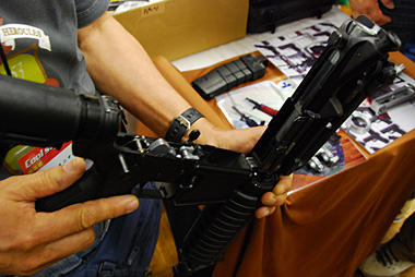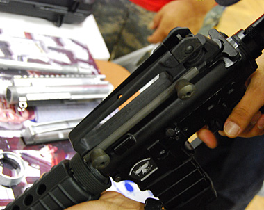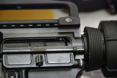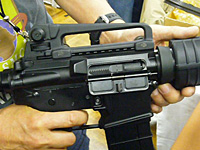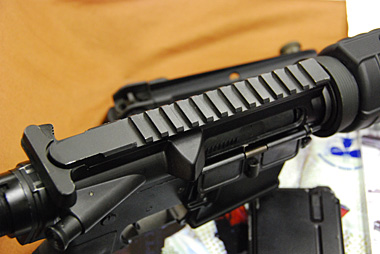 キャリングハンドル、アッパー、ロアレシーバーはアルミダイキャスト製で国内仕様はアルマイト処理される。輸出仕様は安価な焼付け塗装になる。なお、会場に展示されていた試作品は上下のレシーバーは急遽塗装で間に合わせたたそうだ。