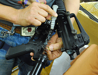 レシーバー後方のテイクダウンピンを引き抜けば、すぐさまアッパーレシーバーをテイクダウンさせることが可能。ハンマーなどの内部パーツ形状もリアルだ。
