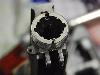 電動ガンのチャンバー形状みたいなアウターバレル。材質はアルミダイキャストだ。