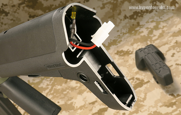 ストックパイプ左右にスティックタイプ、あるいはバットプレート部にミニタイプのバッテリーが収納できます。
