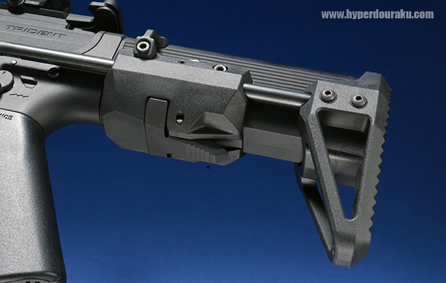 ストック基部がバッテリースペースになっています。旧モデルではここはネジ留めでしたが、ロックレバー式になりました。KRYTACのロゴを押し下げると開きます。