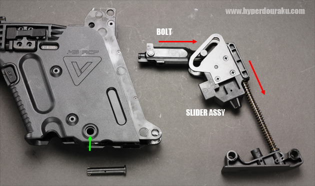 さらにロアレシーバーのピンを抜くと、ボルトとスライダーアッシーが下へ引き抜ける。