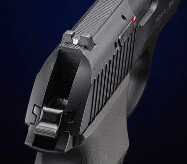 グリップ上部にP230JPの特徴であるマニュアルセフティがある。マニュアルセフティはハンマーが落ちているときか、デコックしたハーフコックポジションで操作でき、セフティオンでスライドを確実にロックする。