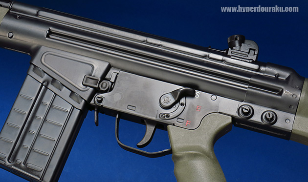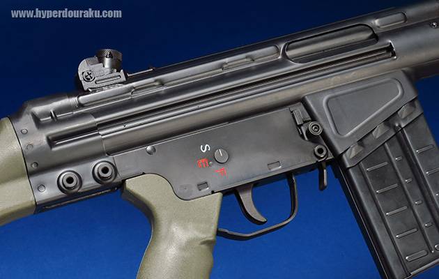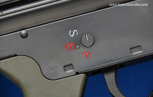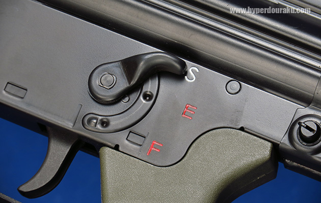 セレクターの表示のS, E, Fはドイツ語で“安全(Sicher)”“単射(Einzelfeuer)”“全自動射撃(unbegrenzter Feuerstoß)”の頭文字です。