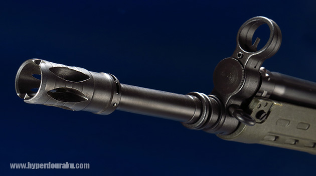 バードケージタイプのフラッシュハイダーを装着。ハイダーは逆ネジで取り外しできます。そしてハイダーもアウターバレルもスチール製です。