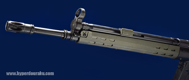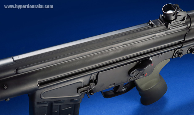 ハンドガードは樹脂製で薄く、スリムです。軍用のG3といえば、このハンドガードになります。ちなみに東京マルイのG3系電動ガンのハンドガードは民間用のHK91がモデルとなっています。
